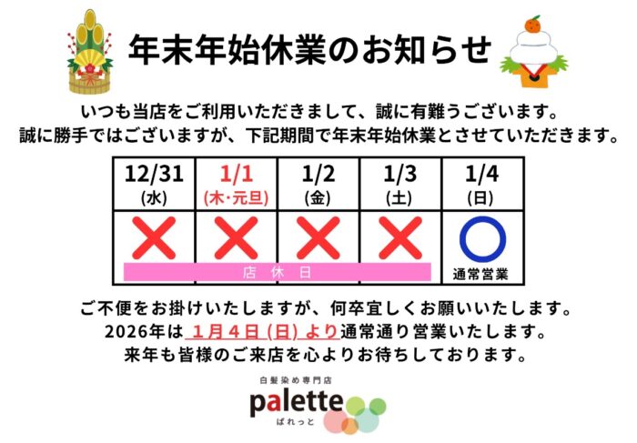 年末年始およびウークイの日は通常営業と異なる場合がございます。